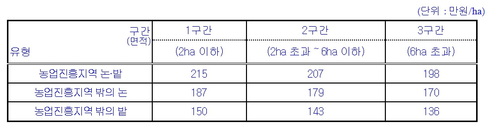 - 지급액: 농지 면적 구간별로 ha당 136만~215만 원 지급.